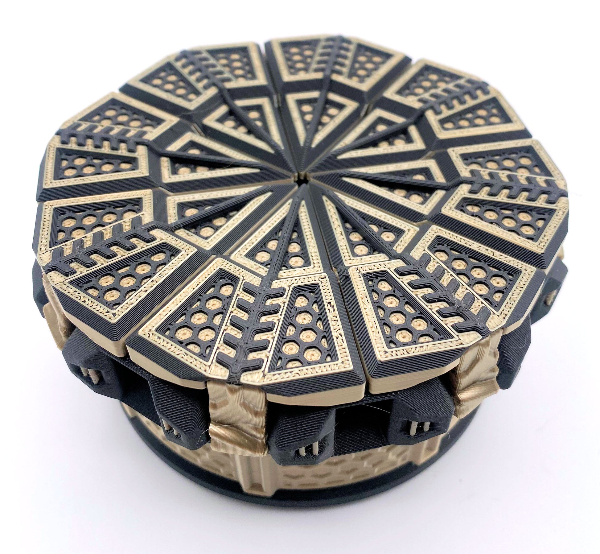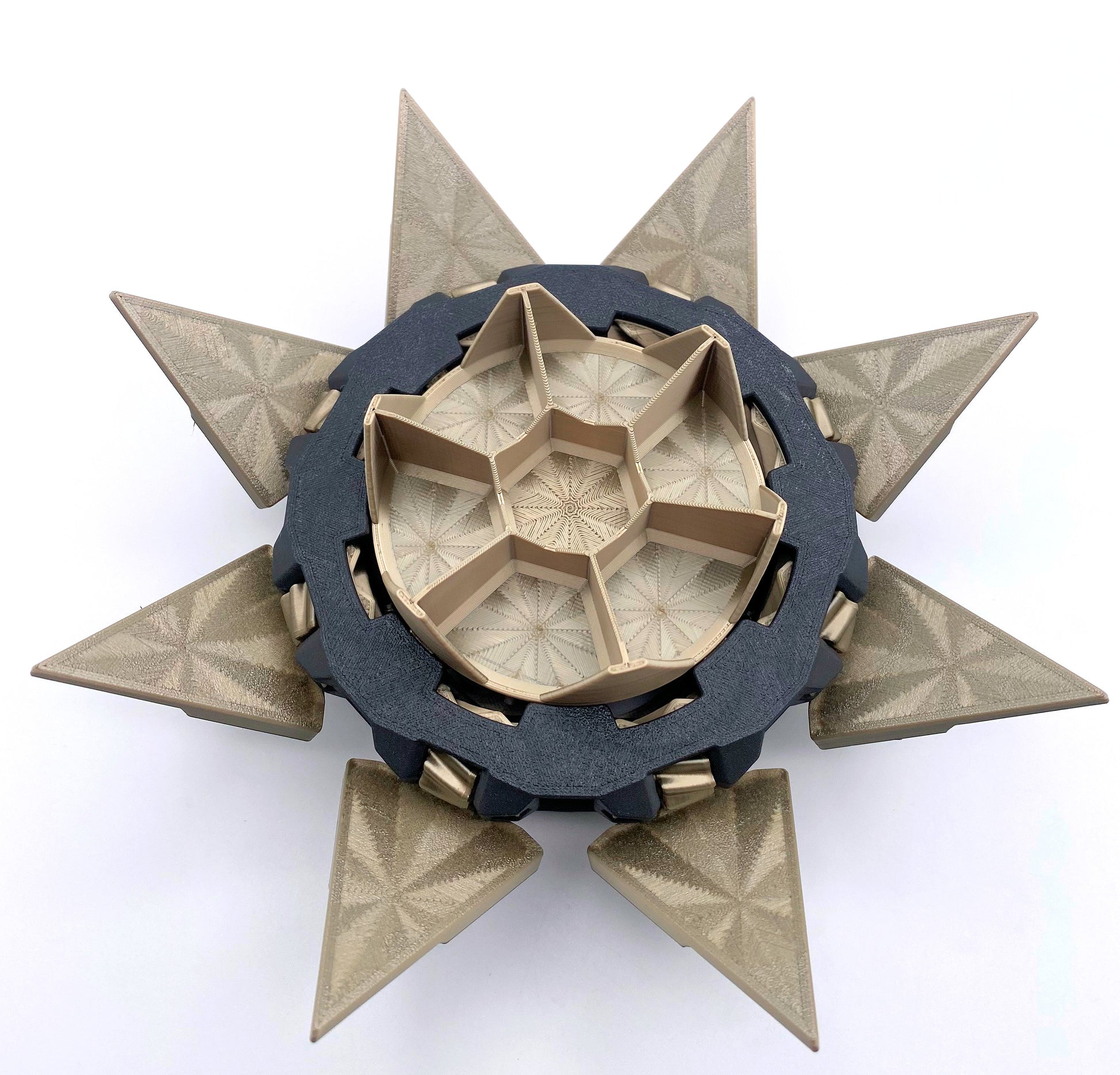 This mechanical box has eight separate doors that tilt upward while you rotate the box from the bottom. At the same time, the interior of the box is lifted upward, revealing the seven dice inside. Perfect to store your favorite dice sets.